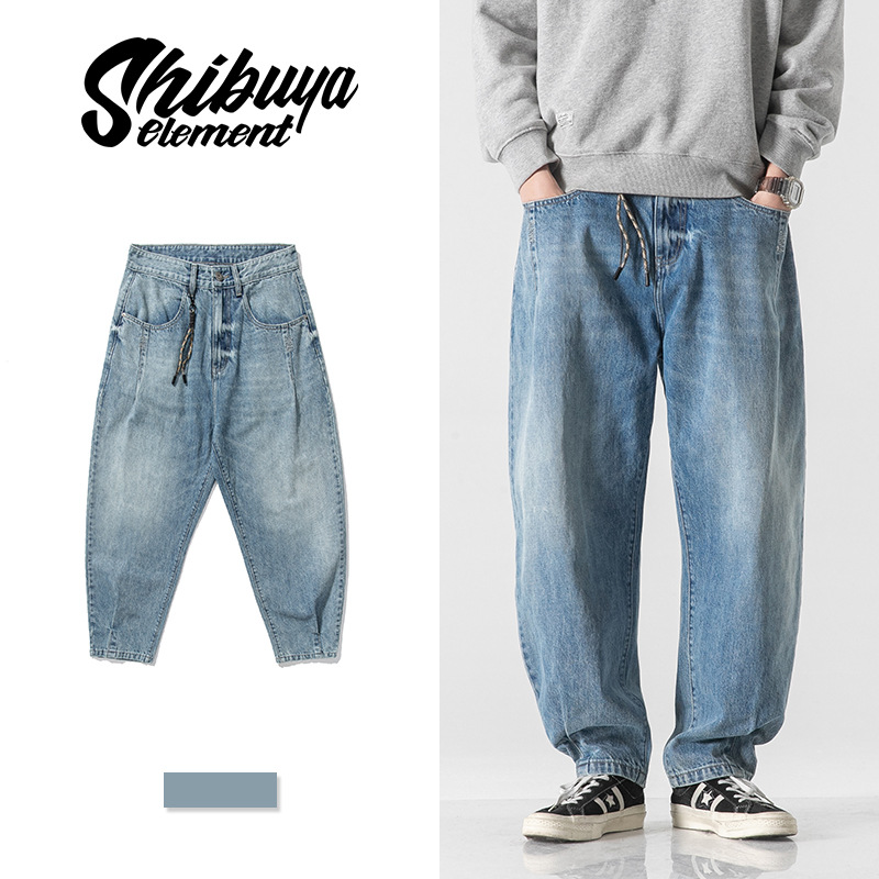 Celana jins longgar kaki lebar untuk pria dan wanita, celana jins kasual retro Jepang bertali kaki lebar, celana lobak untuk pria dan wanita