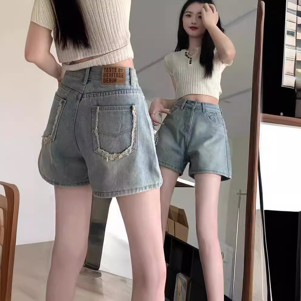 Celana Pendek Pinggang Wol Denim Ukuran Besar Wanita Musim Panas Pinggang Tinggi Gemuk Ukuran 200Kg Longgar Terlihat Kurus Berlubang Celana Panas Huruf A Pelajar