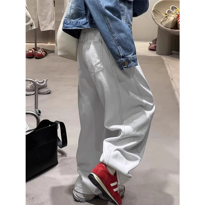 Celana Jeans Solok Warna Putih Wanita Musim Semi Musim Gugur 2025 Ukuran Besar Wanita Gemuk Pinggang Tinggi Longgar Terlihat Kurus Desain Kaki Lebar