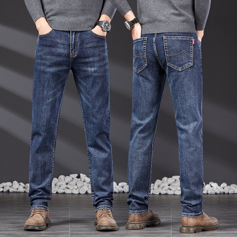 Celana jins pria, lintas batas musim gugur dan musim dingin, celana lurus longgar kasual, melar, serbaguna, bisnis, celana paruh baya dan muda