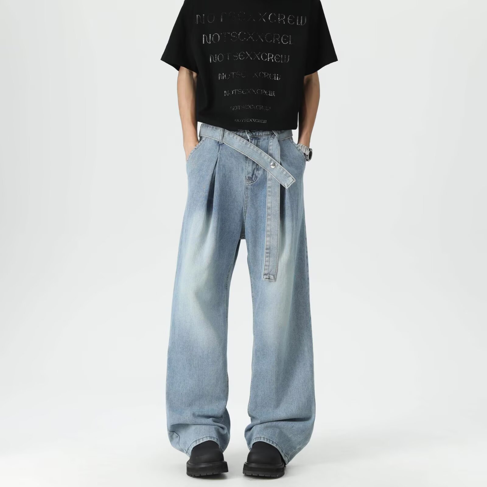 Celana Jeans Modis Model Baru Trendi Elegan Pria Model Baru 2025 Gaya Amerika Desain Ikat Pinggang Celana Kasual Longgar Pakaian Pria