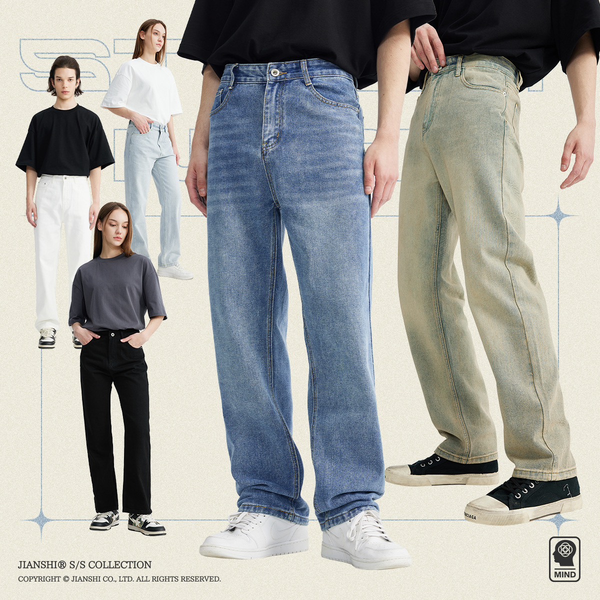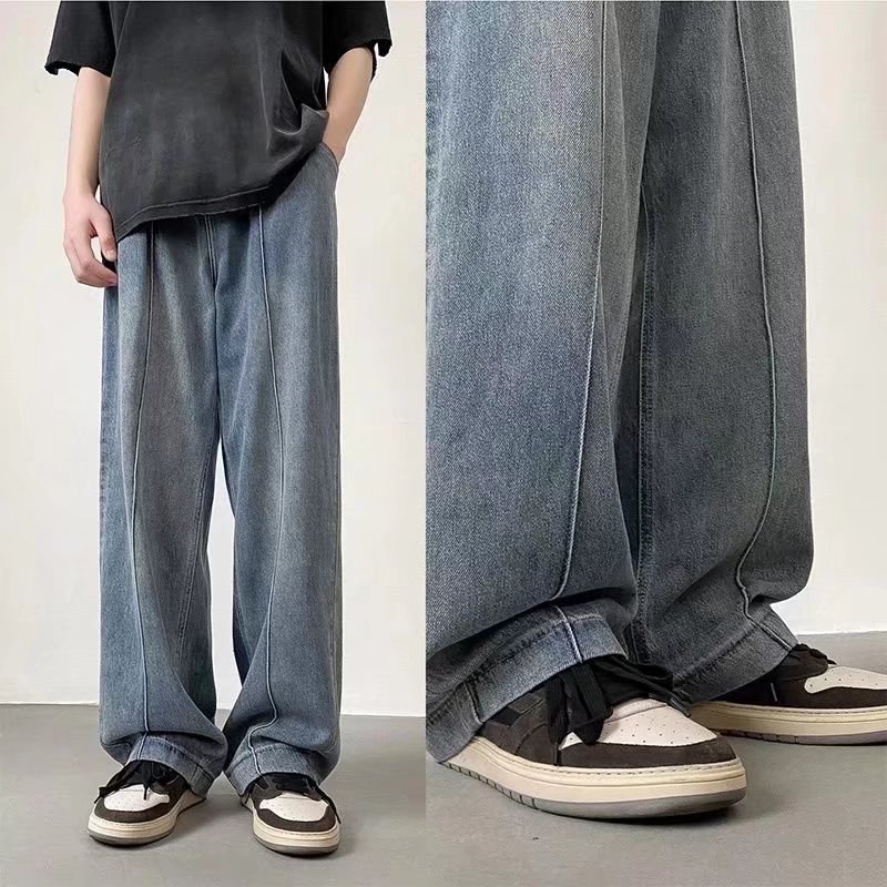 Celana jins pria, celana jins longgar lurus kaki lebar, pakaian pria pel drop-down trendi gaya Korea musim panas 2022