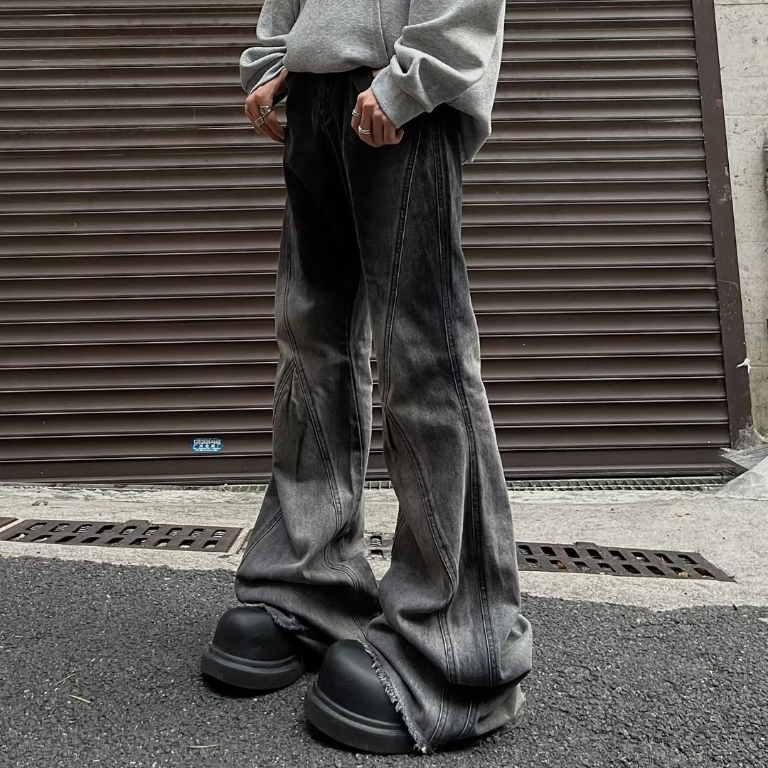 Celana panjang jins berjumbai skinny pria, celana panjang kaki lebar lurus gaya vibe abu-abu hitam musim gugur dan musim dingin