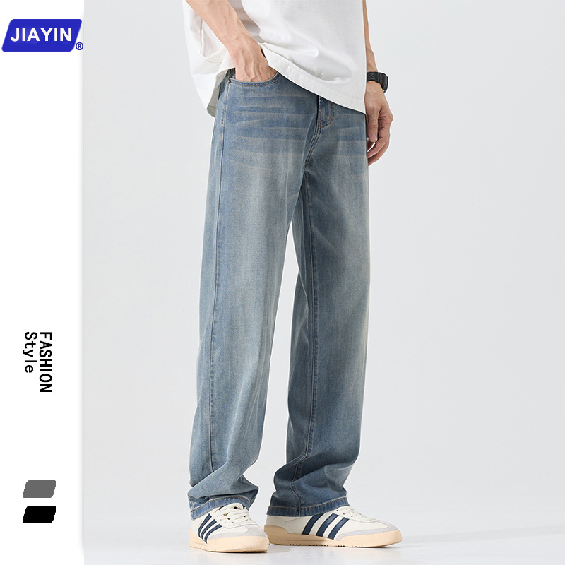 Celana Jeans Sutra Es Pria Musim Panas Tipis Longgar Lurus Merek Trendi Celana Panjang Mudah Dipadu Padan Kaki Lebar Rasa Keren