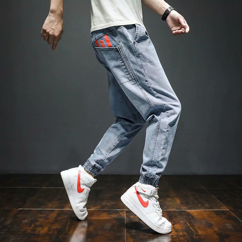 Celana jeans pria musim gugur dan musim dingin gaya Korea merek trendi celana jogger ukuran besar longgar label fashion pinggang elastis celana kasual.