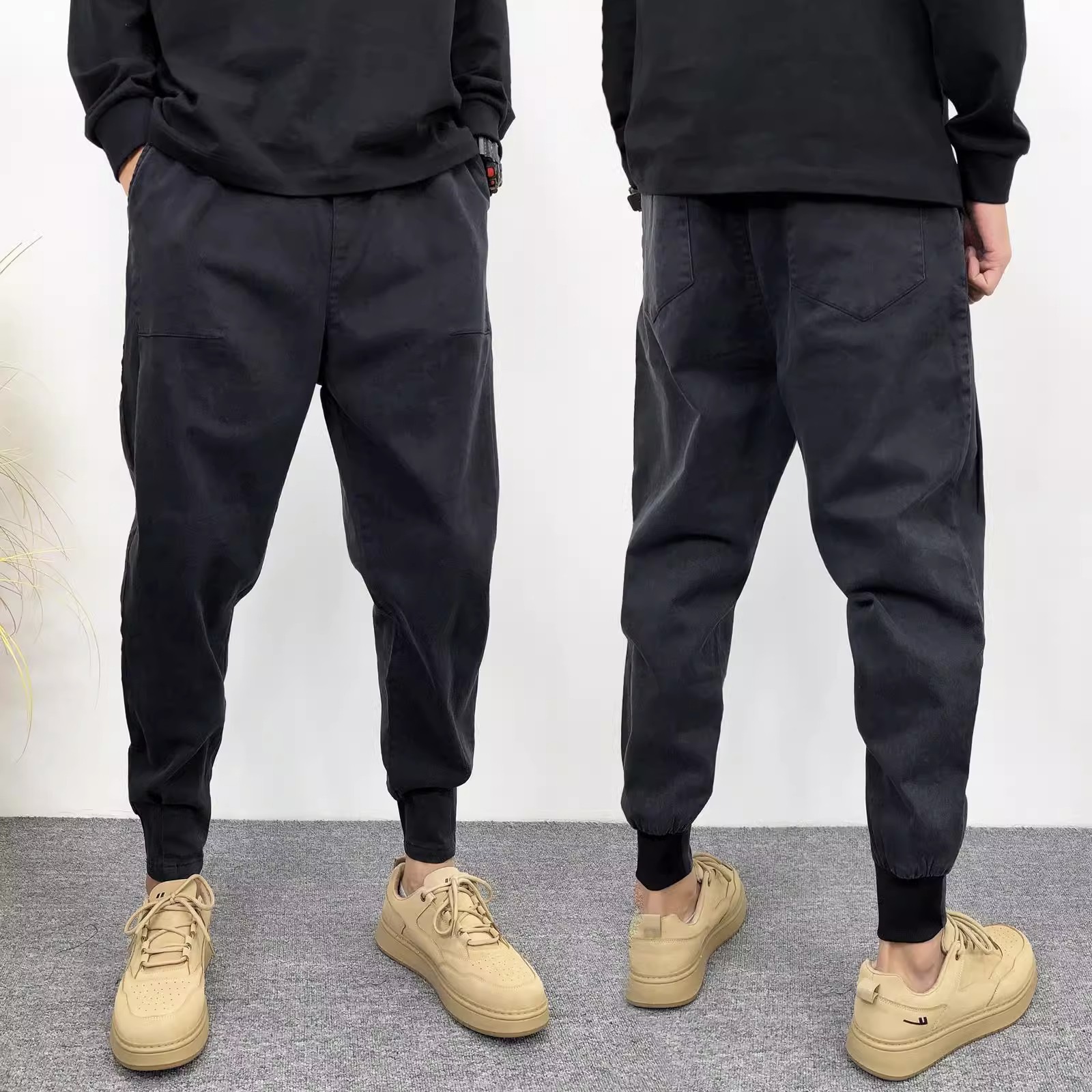 Jins trendi pria, celana jins trendi semua cocok, celana harem kasual longgar, overall tampan, tali pergelangan kaki, hitam trendi, musim semi dan musim gugur
