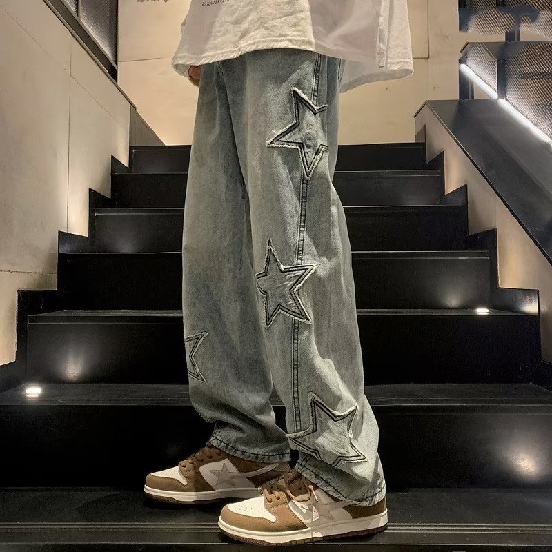 Celana jins bintang lima titik pria musim gugur dan musim dingin celana merek mode jalanan tinggi Amerika celana kaki lebar pel longgar lurus untuk siswa sekolah menengah pertama