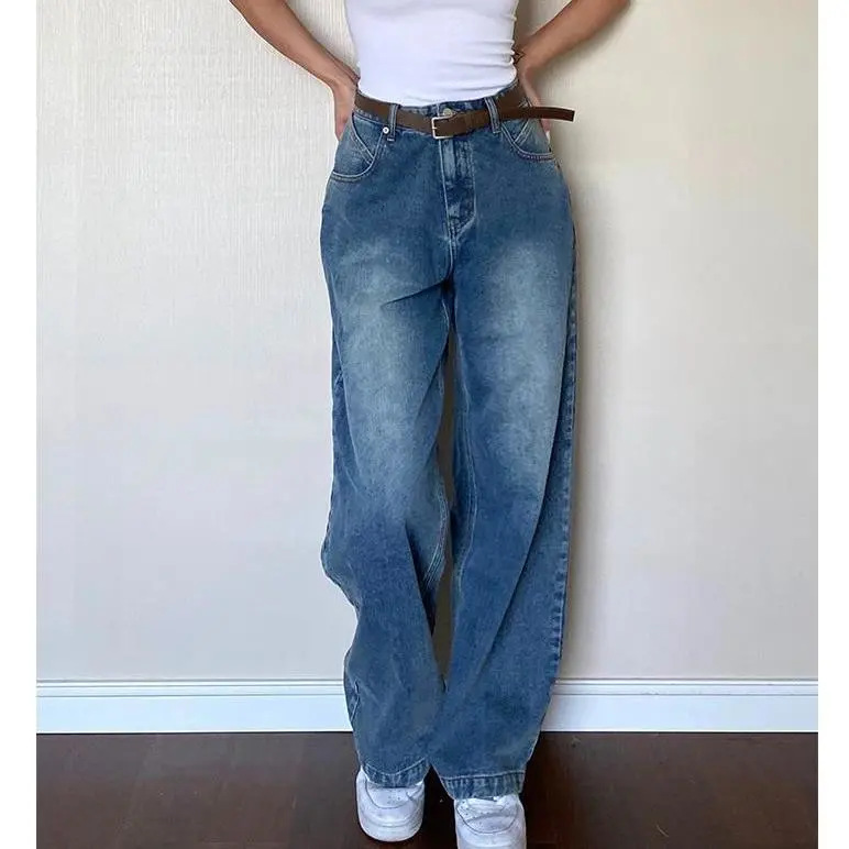 Celana denim panjang model retro vintage bergaya high street, longgar, ramping, warna biru tua, untuk wanita, trendi dan modis tahun 2025