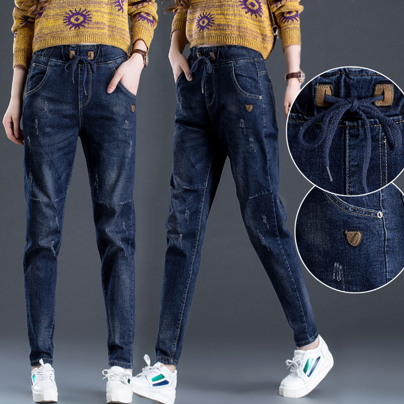 Celana jeans Harem untuk wanita 2023 musim semi dan musim gugur baru longgar ukuran besar tali serut pinggang elastis pinggang tinggi ayah lobak