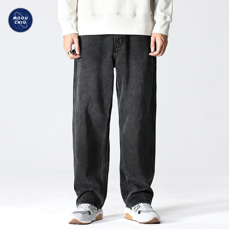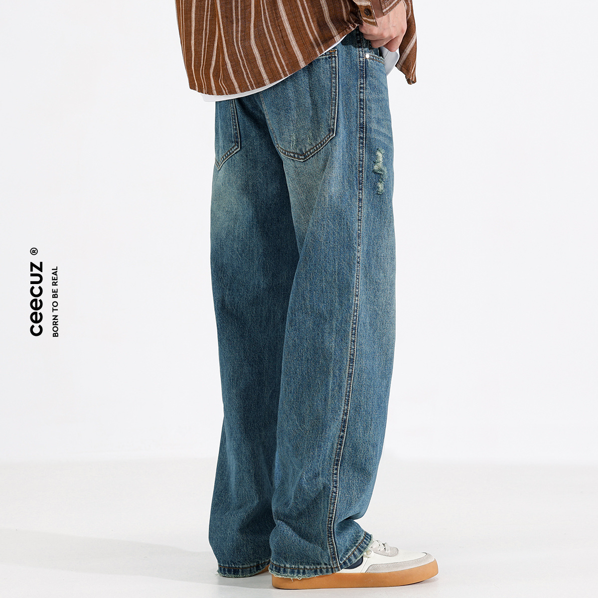 Ceecuz jins lurus pria, celana jins lurus musim semi dan musim gugur baru longgar kaki lebar dicuci celana kasual ukuran besar celana modis