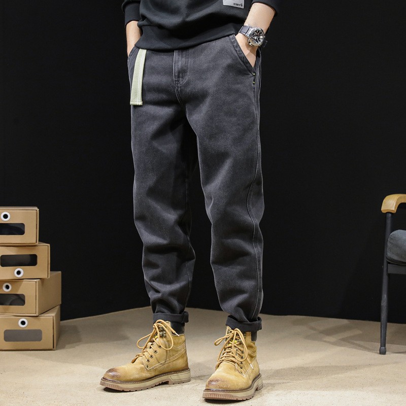 Celana jins ketat pria, jins ramping merek mode lemak, celana harem longgar retro ukuran besar, celana jins bergaris Jepang musim gugur
