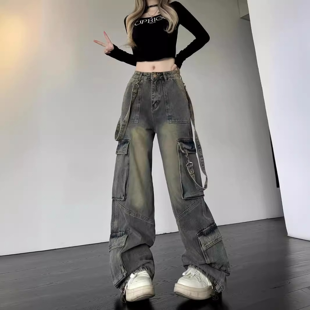 Celana Panjang Kaki Lebar Terlihat Ramping Longgar Retro Gaya Amerika Ukuran Besar Wanita Celana Jeans Pakaian Kerja Banyak Saku di Jalan Tinggi Niche Gadis Bertubuh Gemuk Trendi