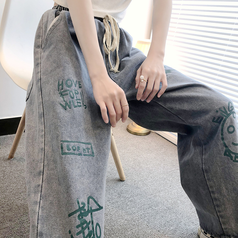 Celana jins lurus elastis wanita, celana jins grafiti kaki lebar ukuran besar 200kg longgar
