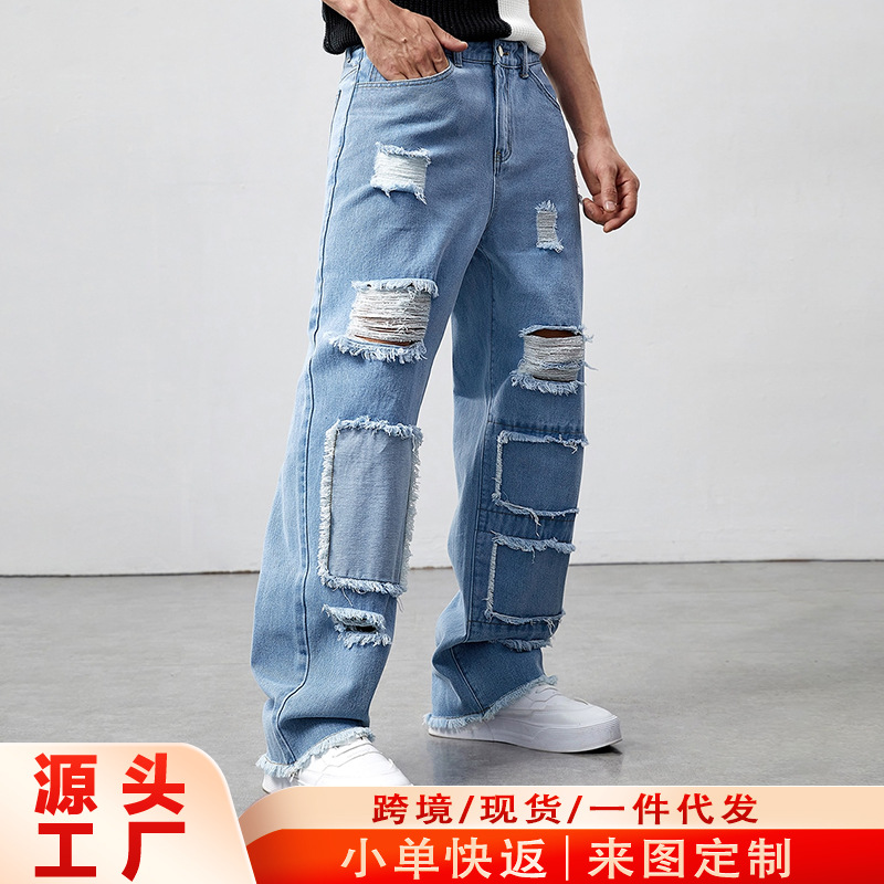 Celana Jeans Lurus Longgar Berlubang 2024 Model Baru Lintas Batas Ukuran Besar Pakaian Pria Celana Kasual Jahitan Kombinasi Pabrik Grosir