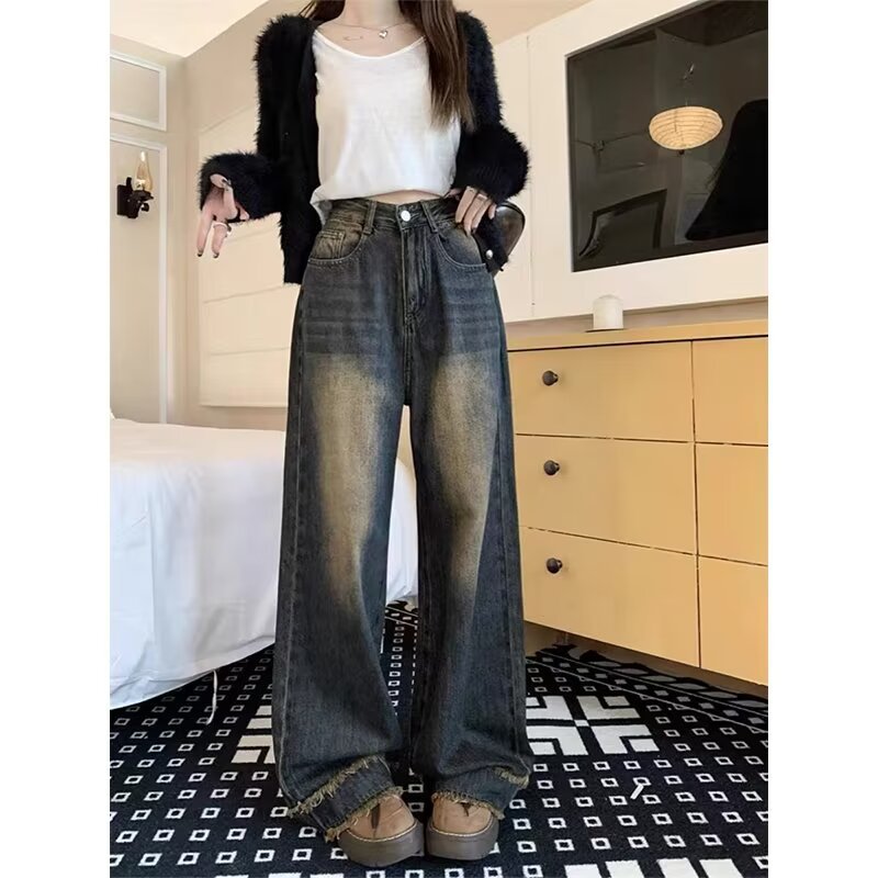 Celana jeans lurus longgar wanita, celana pel ukuran besar retro Amerika musim gugur dan musim dingin pinggang tinggi berjumbai kaki lebar