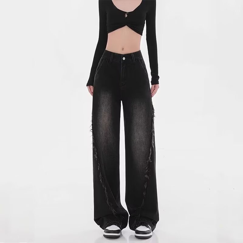 Celana Jeans Asimetris Pinggir Bulu Retro Gaya Amerika Ukuran Besar 2025 Celana Panjang Wanita Sambung Longgar Jalan Tinggi Lurus Kaki Lebar Trendi