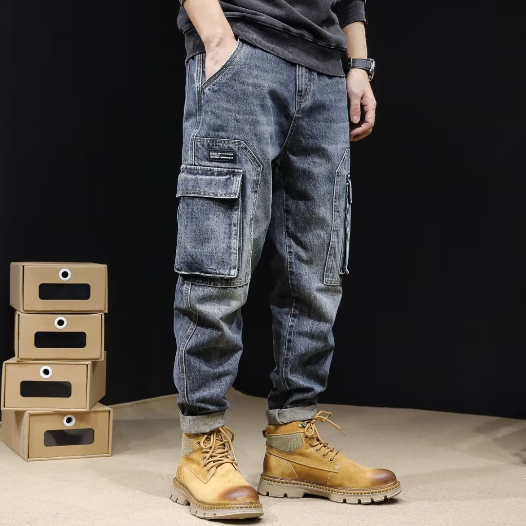 Jeans merek fashion musim semi dan musim gugur overall multi-saku lurus longgar pria fashion kasual ukuran besar baru dan musim gugur 2023