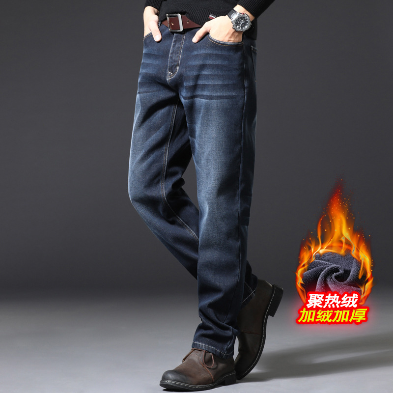 Celana jins pria ukuran besar, celana Denim lurus Semua cocok bisnis meregang longgar bergaris bulu domba baru musim dingin ukuran besar