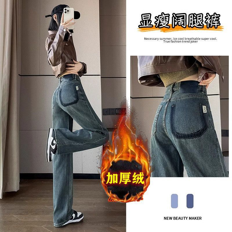 Jins lurus beludru tebal ramping, bentuk pir sempit untuk wanita ukuran besar pinggang tinggi musim dingin 2023