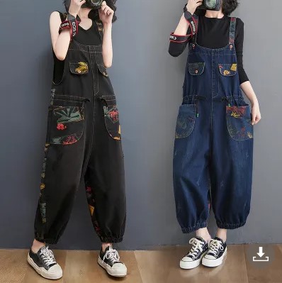 2021 musim semi baru artistik ukuran besar dicetak jahitan Denim celana suspender untuk wanita