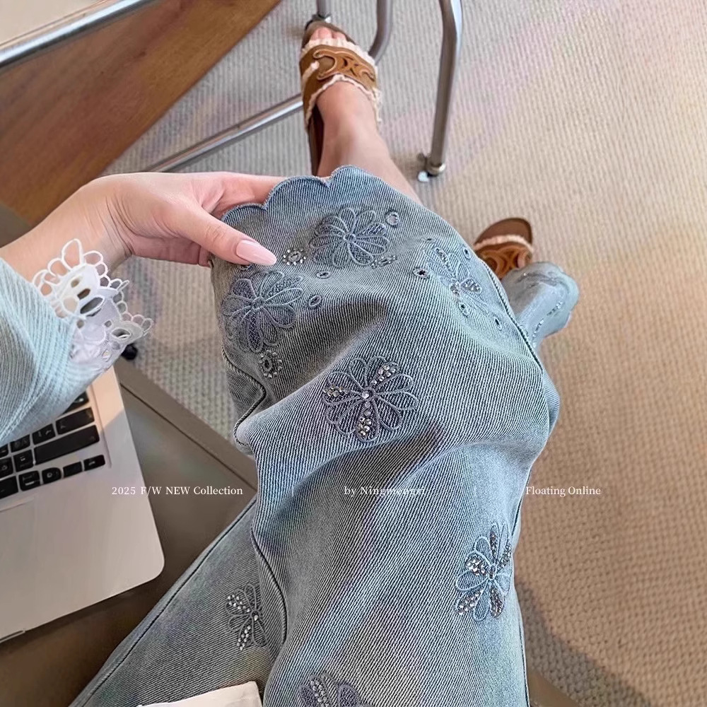 Celana Jeans Lurus Berlian Panas Bordir Bunga Celana Asap Terlihat Ramping Pinggang Tinggi Berukuran Besar Wanita Kecil Berukuran Besar Model Baru Musim Panas Musim Semi