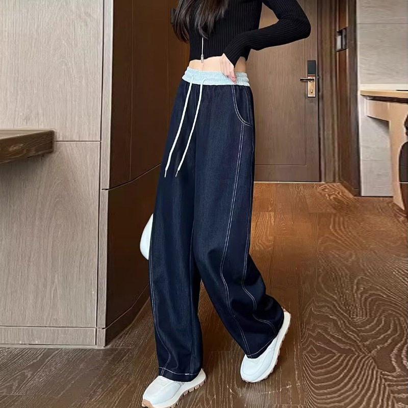 Celana Jeans Warna Kontras Kombinasi Retro Model Baru Musim Semi dan Musim Gugur Celana Lebar Wanita Pinggang Elastis Mudah Dipadu Padan Terlihat Kurus Longgar Ukuran Besar