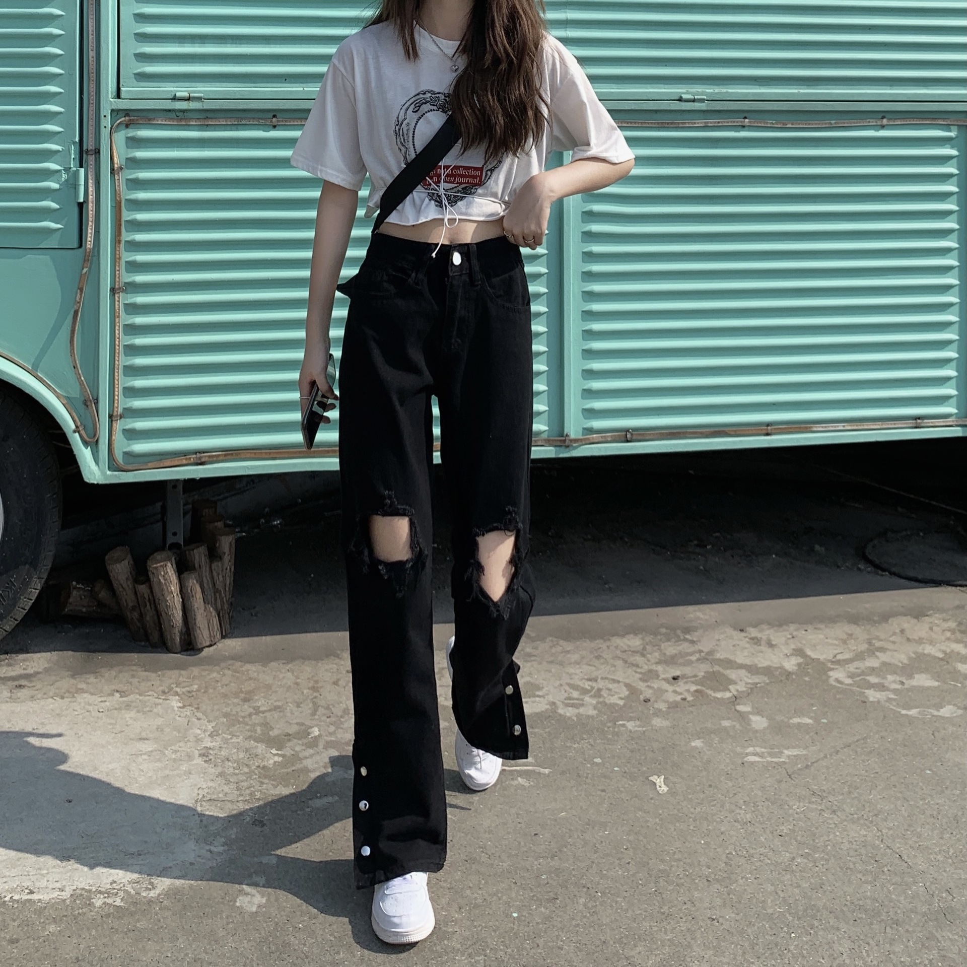 大码黑色破洞纽扣开叉牛仔裤女春秋胖妹妹mm高街显瘦阔腿拖地裤子