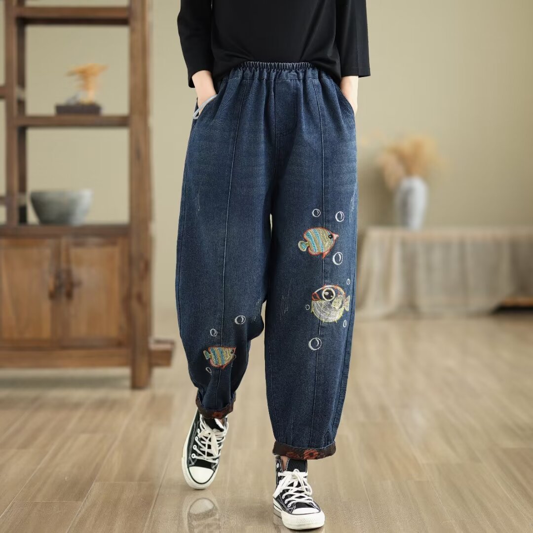 Celana jeans kasual ukuran besar dengan pinggang elastis untuk wanita, model baru musim semi dan gugur 2024, gaya etnik slim fit, celana harem panjang bersulam untuk wanita
