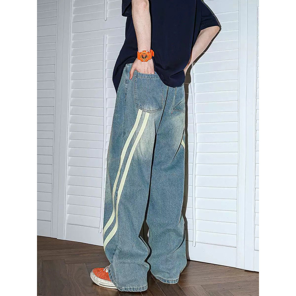 美式复古水洗条纹拼接牛仔裤男春秋季新款宽松直筒百搭休闲长裤子