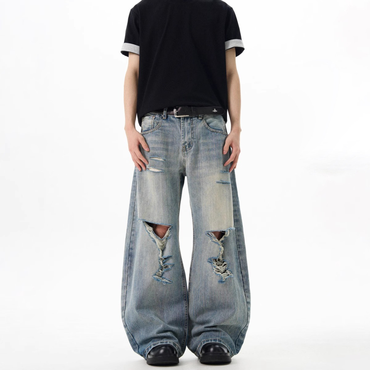 11KN Celana Jeans Lubang Pemotong Pisau Biru Retro Gaya Amerika Celana Panjang Santai Dicuci Air Longgar Lurus Trendi Pria Wanita