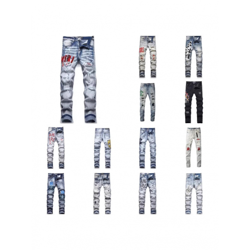 Celana Jeans Pria High Street AM Eropa Celana Pensil Membentuk Badan Elastis Trendi Bordir Berlubang Celana Kasual Pria