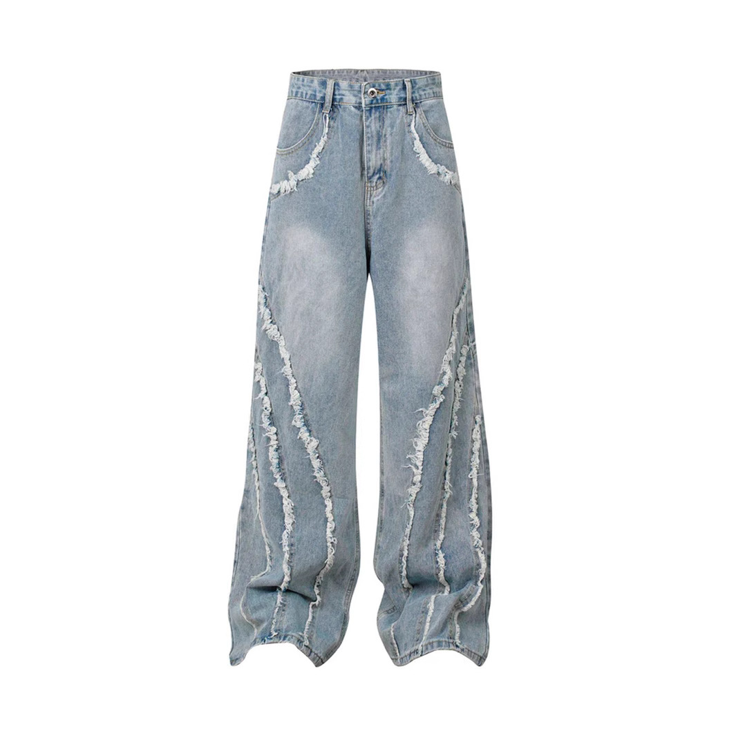Denim Musim Panas Pinggiran Bulu Lurus Retro Gaya Amerika Trendi Model Baru Celana Melepuh Pria Wanita Longgar Pinggiran Rambut