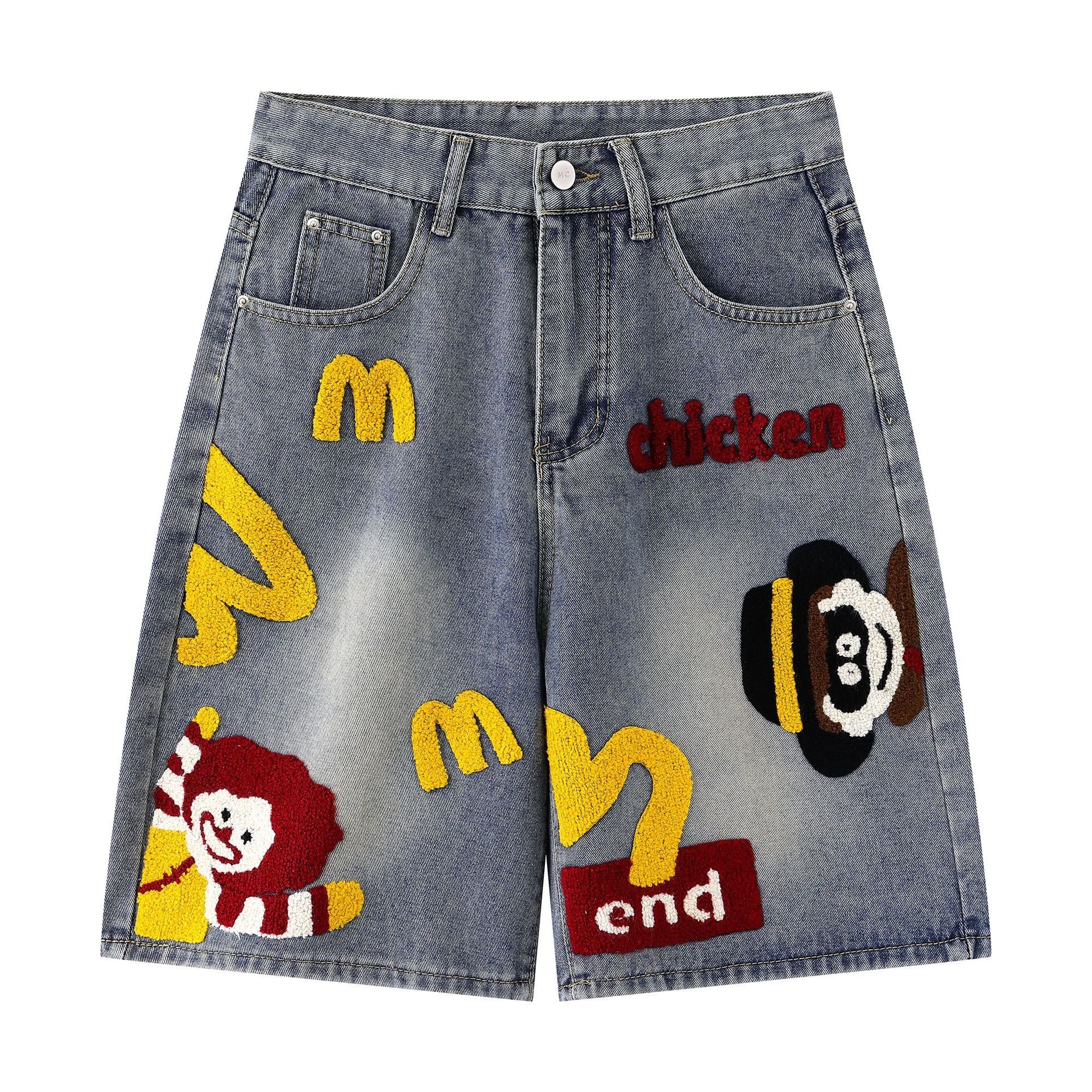 Celana Pendek Denim Bordir Handuk Menyenangkan Retro Gaya Amerika Pria Wanita Musim Panas Merek Trendi Madonna Kartun Celana Selangit Celana Kuda Trendi