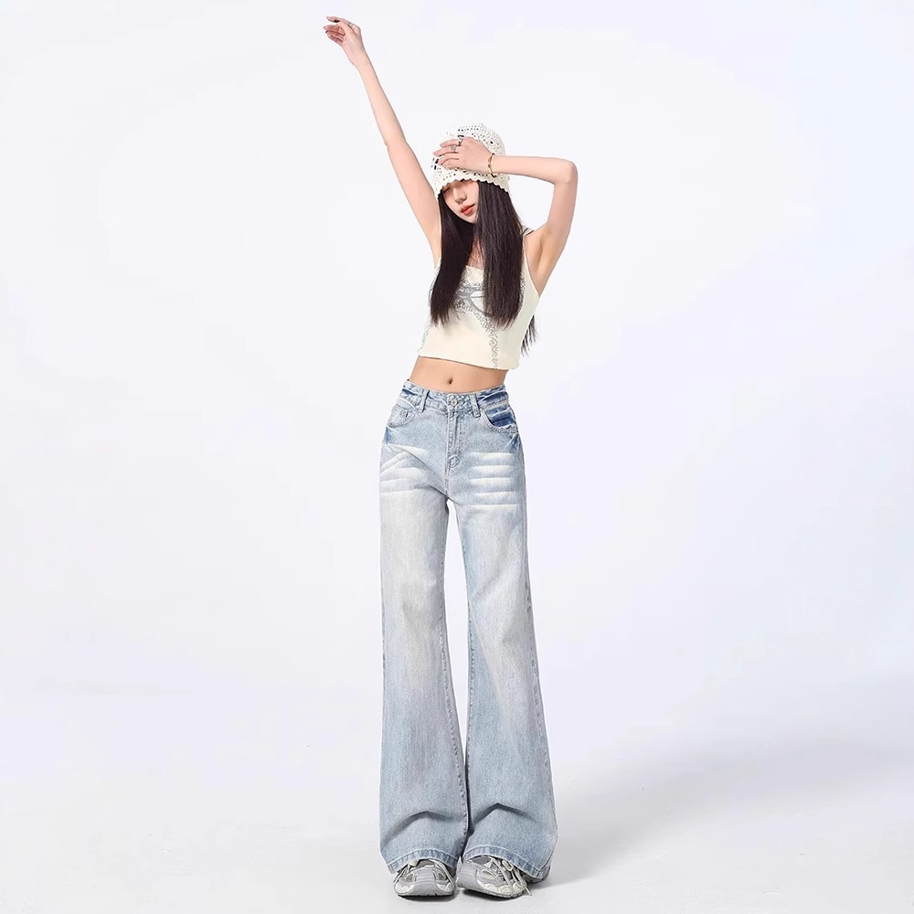Pakaian Wanita Ukuran Besar Celana Jeans Speaker Kaki Lebar Warna Biru Celana Tapal Kuda Tidak Tempel Kaki Pinggang Tinggi Model Baru Musim Semi Wanita