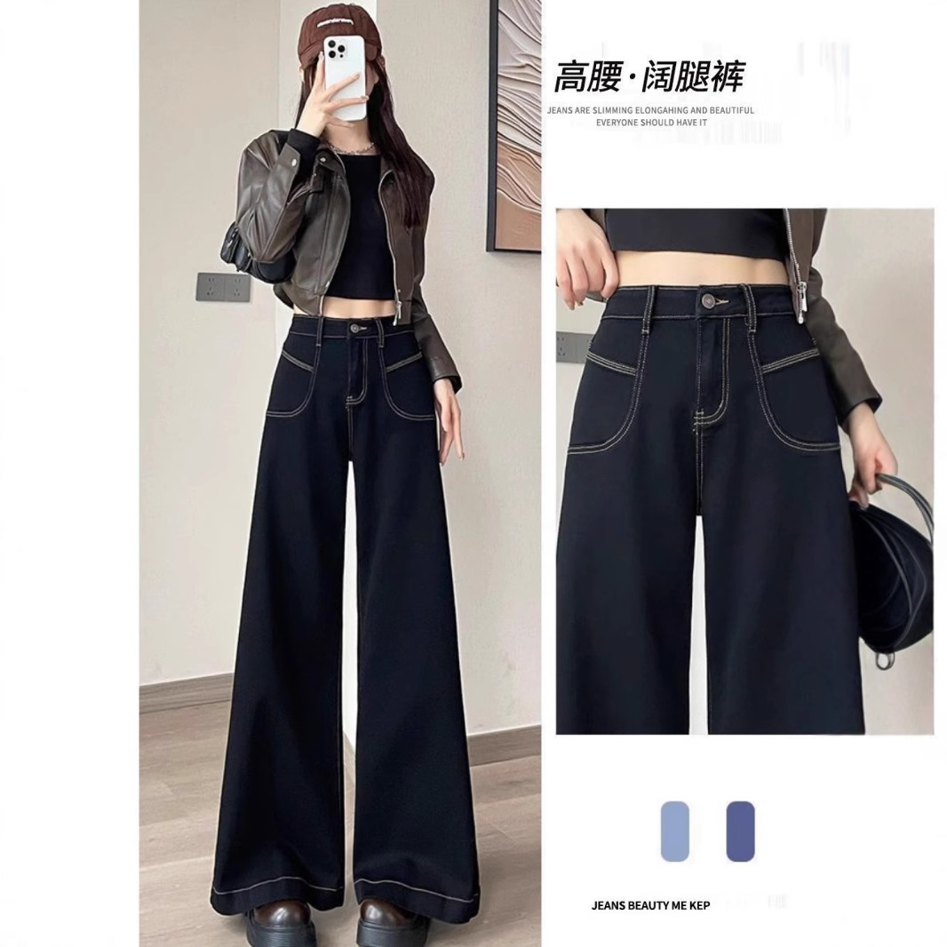 Celana Panjang Jeans Elastis Pinggang Sedang Kaki Lebar Kancing Depan Jahitan Cuci Air Retro Ukuran Besar Amazon Eropa dan Amerika