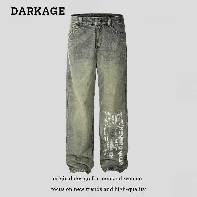 Mode Amerika desain baru Celana Jin dicuci celup lumpur kuning celana pel longgar lurus Semua cocok