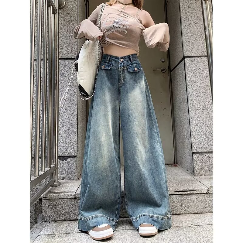 Jins pel panjang super panjang kaki lebar biru dicuci gaya Eropa dan Amerika Cross-border celana kasual longgar wanita