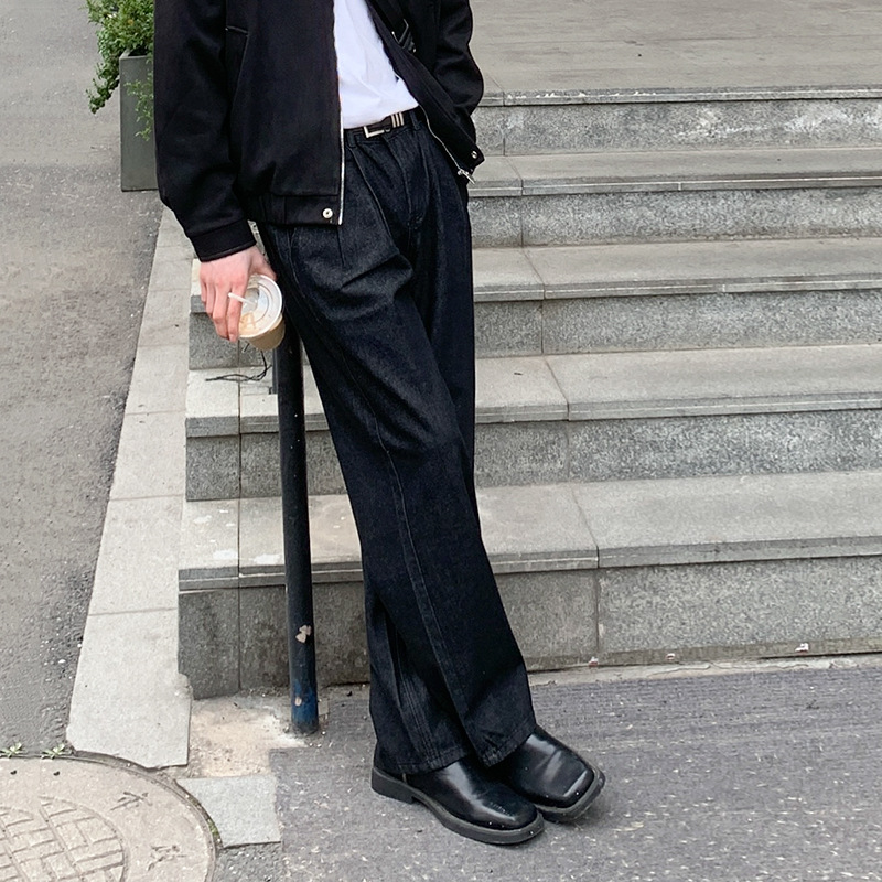 Celana jins serut lurus longgar untuk pria, celana panjang Jin gaya Hong Kong kaki lebar kasual serbaguna jalanan Tinggi tipis musim gugur untuk pria