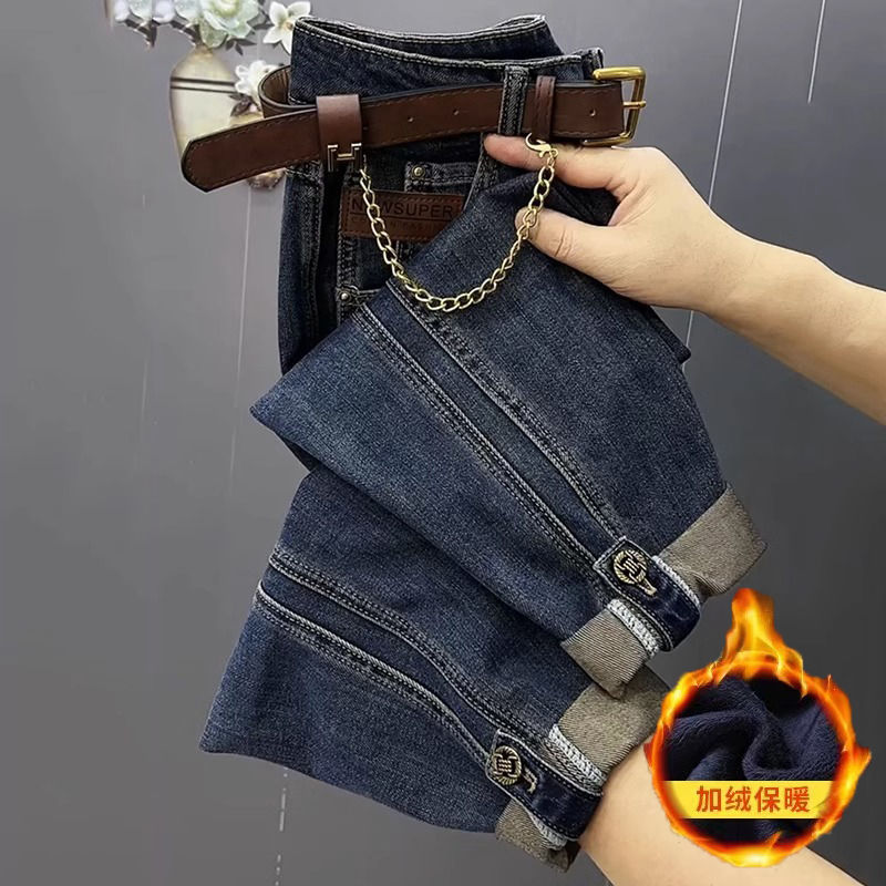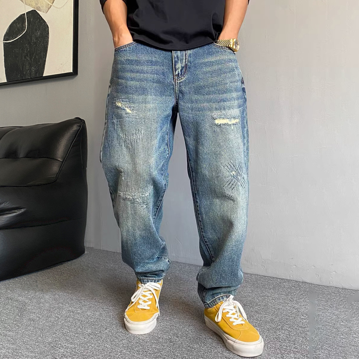 Celana Jin ukuran plus untuk pria, celana Jin gaya Hong Kong trendi longgar ukuran plus, celana panjang kasual musim gugur untuk pria