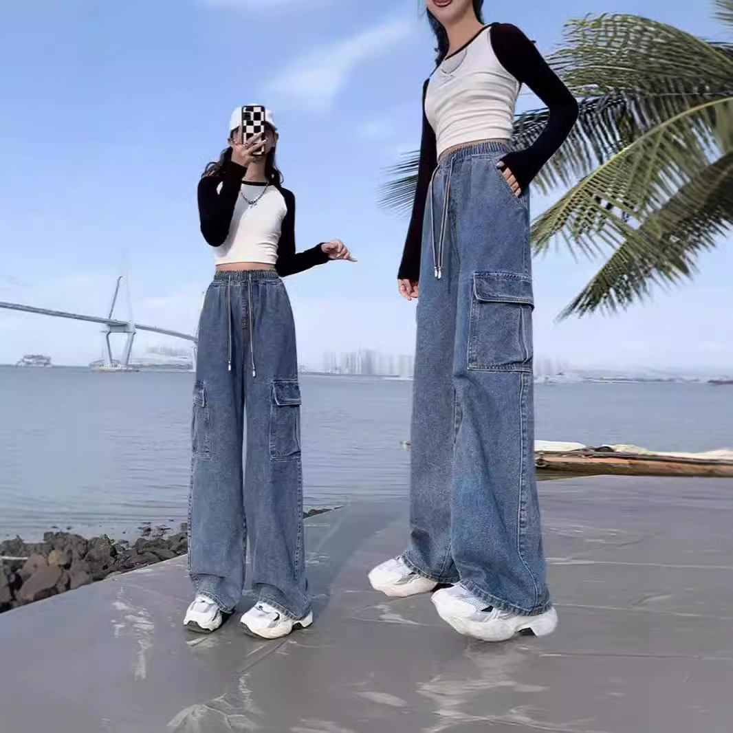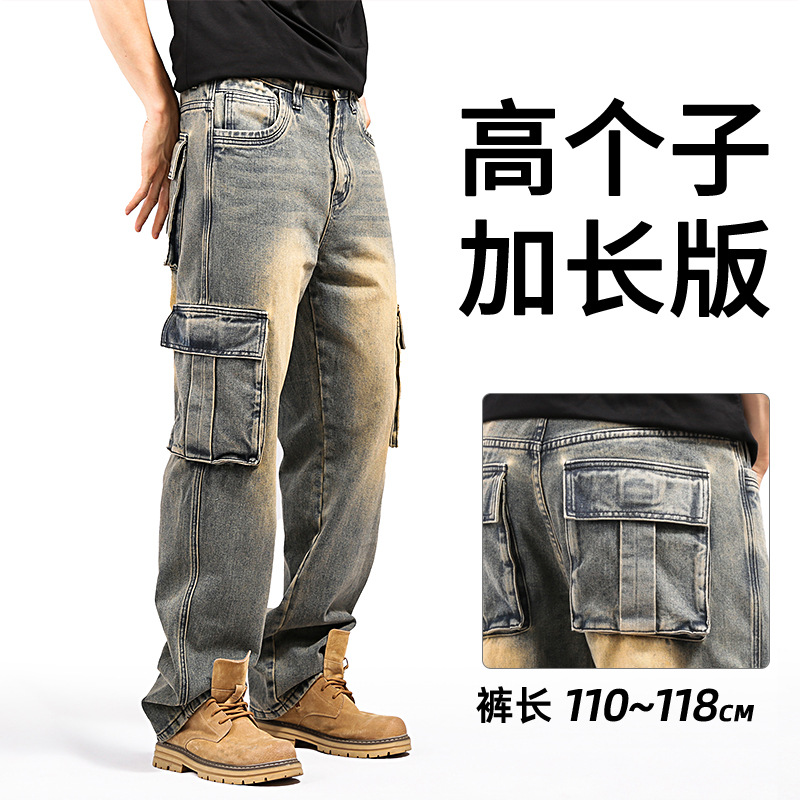 Celana Jeans Kerja Multi-Saku Versi Panjang Tinggi Versi Amerika Model Pria Kaki Lebar Longgar Merek Trendi Jalan Tinggi Berat Ukuran Besar