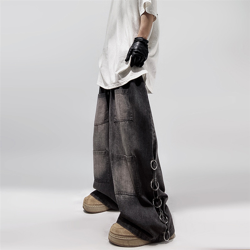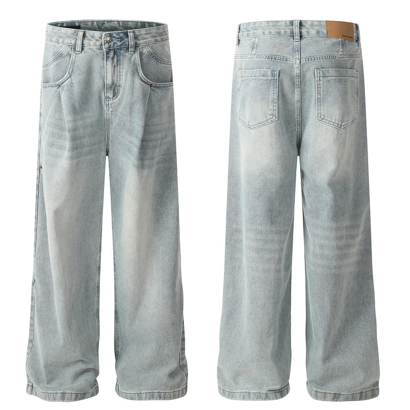 Merek trendi Jiayiku | Celana jeans model retro Amerika bergaya high street dengan efek ripple wash, potongan lebar dan longgar