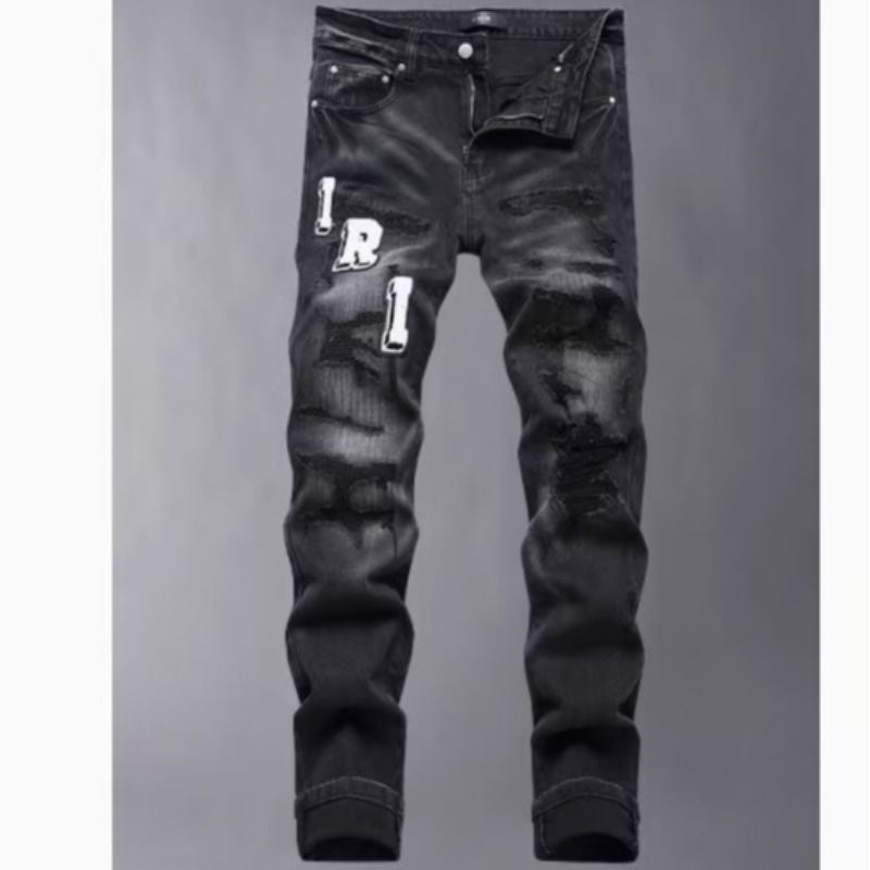 Celana Jeans Kaki Kecil Elastis Ramping Bordir Bordir Patch Lubang Model Baru Merek Trendi Model Jalanan Populer Pria Kepribadian