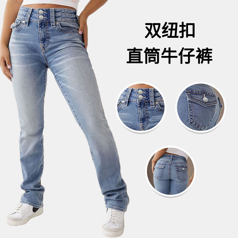 Celana jeans lurus berpinggang sedang dengan dua kancing untuk wanita Eropa dan Amerika, musim semi dan panas 2025, model melangsingkan dan elegan, panjang, seksi, dan menawan.