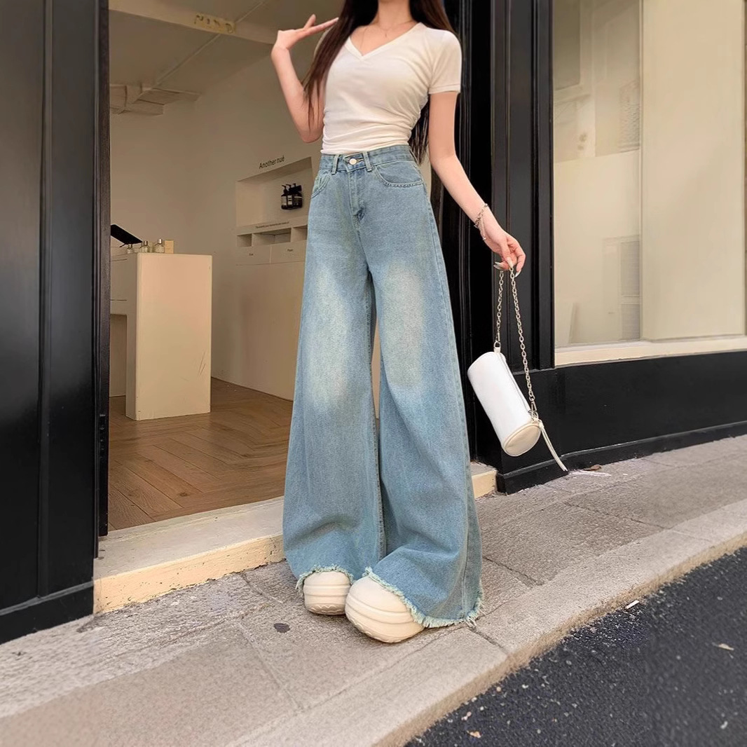 Jeans pinggang tinggi wanita, celana pel kaki lebar longgar lurus tipis musim panas 2023 baru