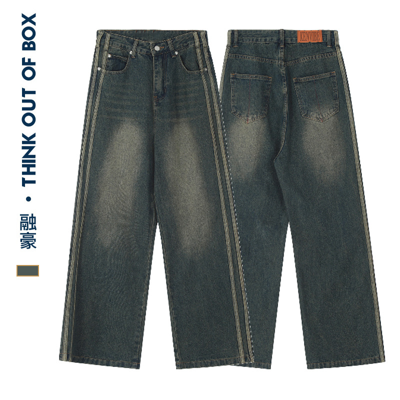 Celana jins pria trendi retro Amerika, celana jins trendi, celana mengepel tanduk mikro longgar lurus, jins bergaris sisi distressed retro Amerika
