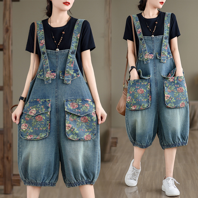 Celana Suspender artistik musim gugur, celana Denim suspender wanita retro ukuran plus longgar kaki lebar celana harem kasual modis