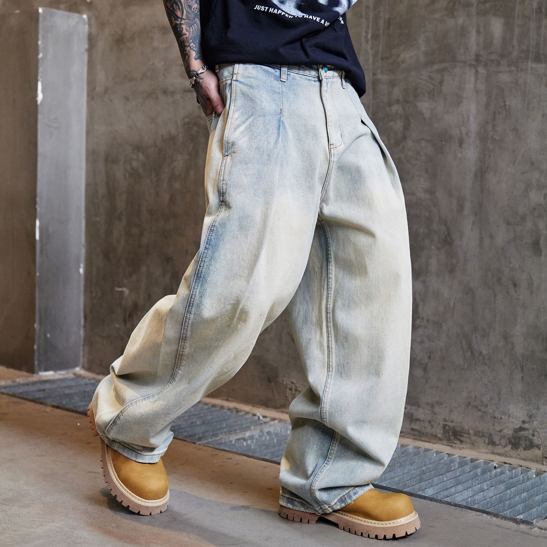 GD Grosir Perdagangan Luar Negeri Merek Trendi Retro Celana Jeans Tinta Parah Lama Celana Panjang Pria Kaki Lebar Lurus Tinggi