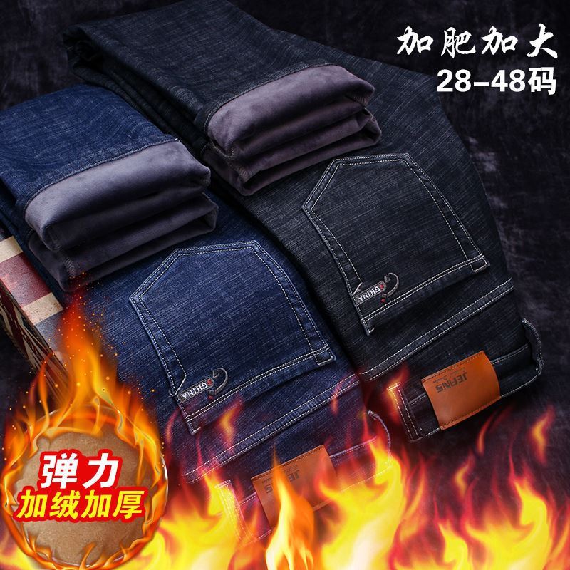 Jins Fleece-lined pria, celana Jin longgar ukuran plus tebal kasual ekstra besar gemuk tahan aus fashion musim dingin