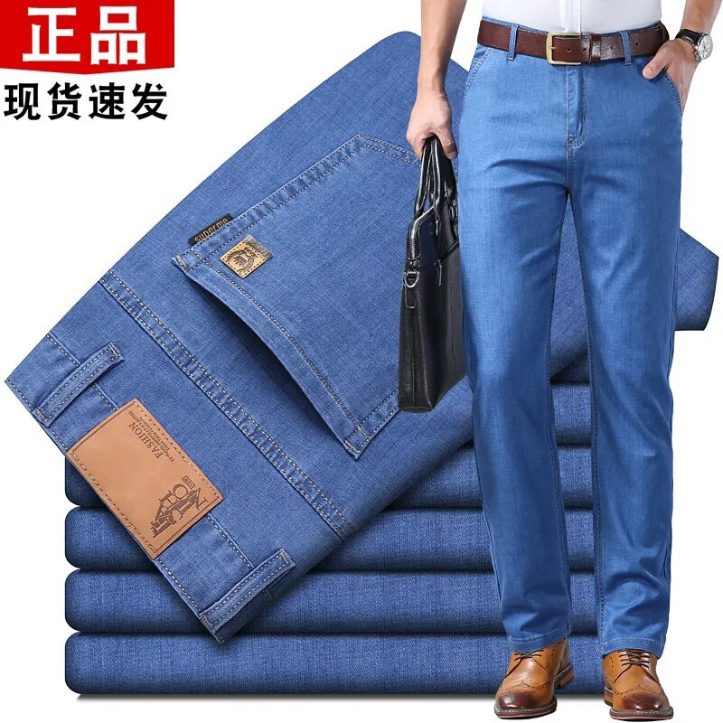 Celana jeans bisnis Tencel untuk pria, celana panjang pria lurus longgar untuk segala musim, celana panjang pria ukuran besar untuk musim gugur.