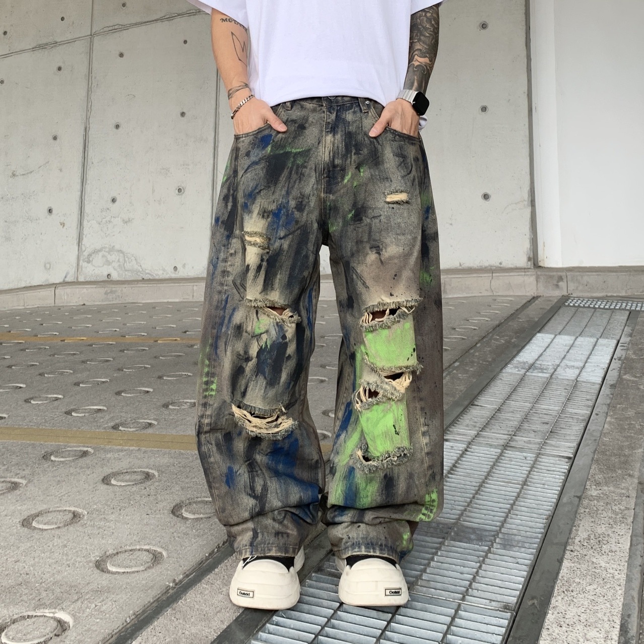 Celana Jeans Pria Lubang Kaki Lebar Dicelup Air Dye Kotor Merek Trendi Amerika Celana Melepuh Kasual Lurus Longgar Tinggi Musim Panas